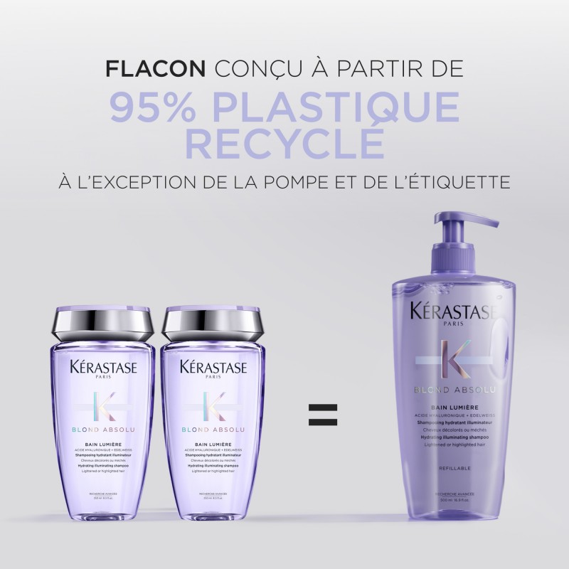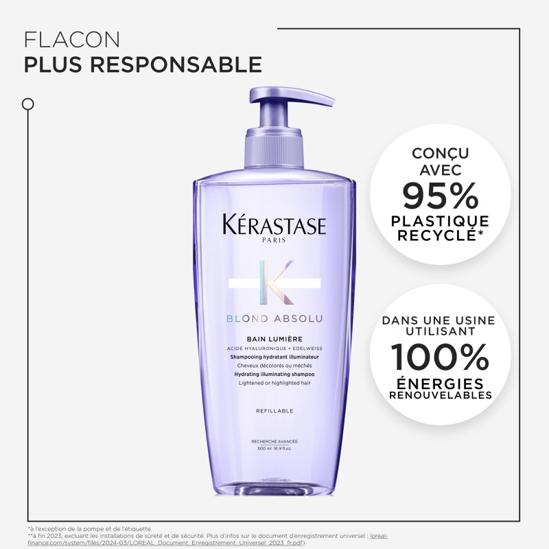 Le flacon de shampooing rechargeable de 500 ml, fabriqué avec 95 % de plastique recyclé*, dans une usine Waterloop** qui a atteint 100 % d'énergie renouvelable***, peut être réutilisé avec la recharge de shampooing associée, fabriquée avec -82 % d'emballages en plastique****.