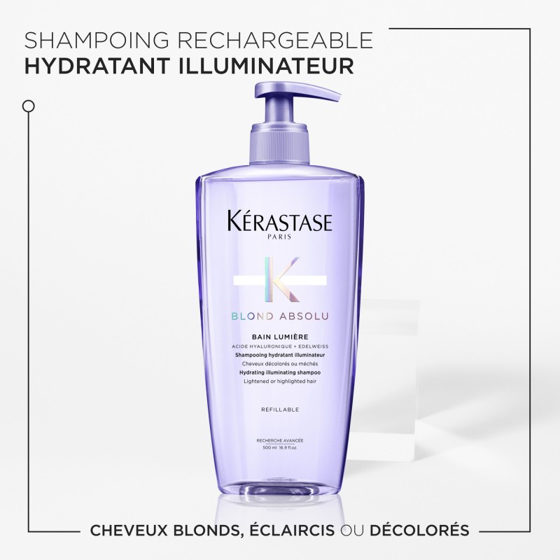 Le Bain Lumière Blond Absolu de Kérastase est un shampooing hydratant pour tous les types de blonds qui souhaitent des cheveux plus sains et plus brillants. Il est spécialement formulé avec de l'acide hyaluronique et de l'extrait de fleurs d'Edelweiss, pour offrir le meilleur shampooing hydratant et illuminant.