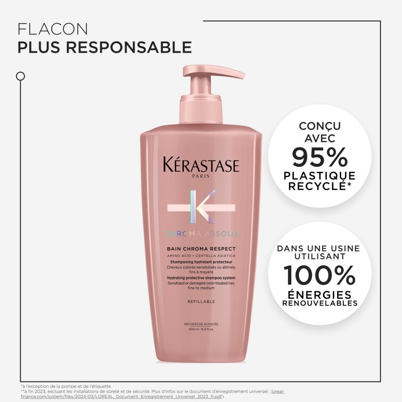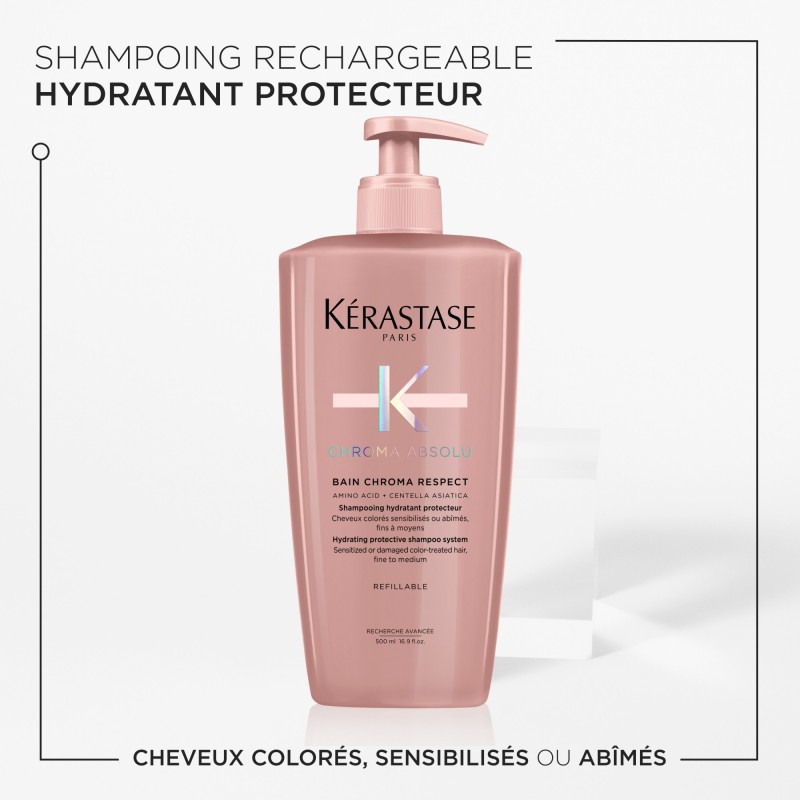 Le Bain Chroma Respect est un shampooing protecteur hydratant et doux pour tous les types de cheveux colorés, sensibilisés ou abîmés, principalement adapté aux cheveux d'épaisseur fine à moyenne.