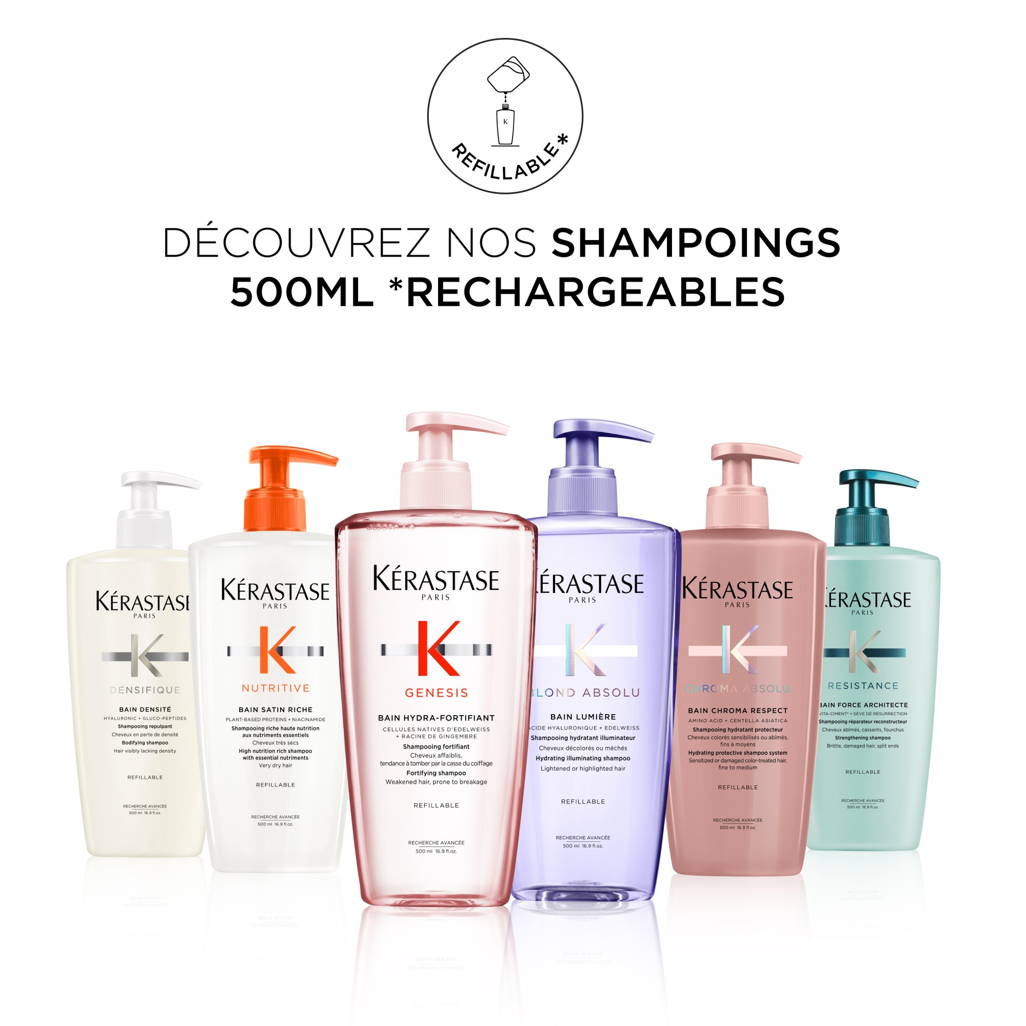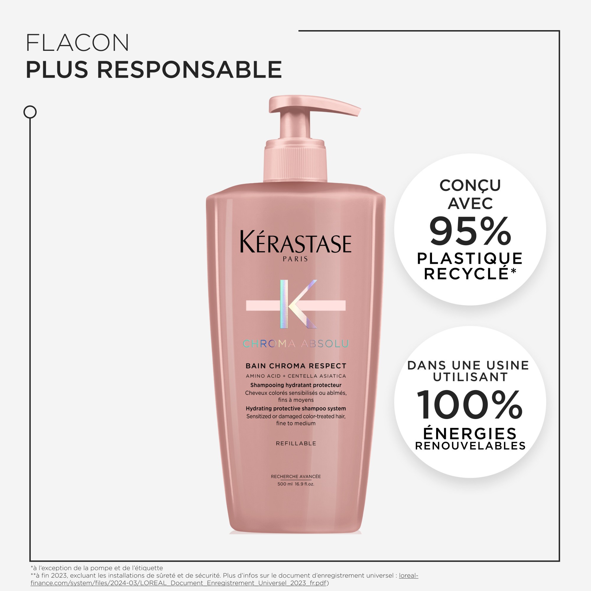 Le flacon de shampooing rechargeable de 500 ml, fabriqué avec 95 % de plastique recyclé*, dans une usine Waterloop** qui a atteint 100 % d'énergie renouvelable***, peut être réutilisé avec la recharge de shampooing associée, fabriquée avec -82 % d'emballages en plastique****.