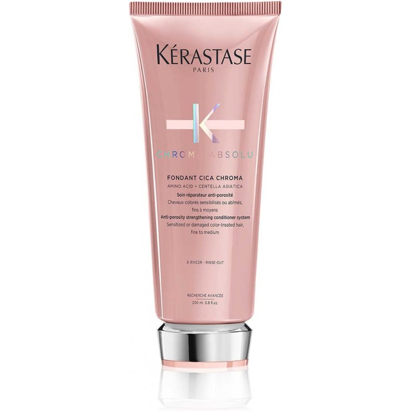 Le Fondant Cica Chroma Kérastase est un après-shampoing qui renforce la fibre capillaire et préserve la couleur des cheveux colorés sensibilisés ou abîmés. Sa crème légère rose pâle sublime et hydrate les cheveux fins à moyens pour un toucher doux et une couleur plus brillante et plus durable. Infusé d'acide aminé et de Centella Asiatica, cet après-shampooing est capable de pénétrer profondément au cœur de la fibre capillaire, pour des mèches 86% plus fortes* et réduire la porosité de la fibre pour une couleur plus brillante et plus durable. Utilisation après utilisation, les cheveux sont renforcés et 92% de l'intensité de la couleur est préservée après 6 semaines**. 8/10 consommateurs affirment que leurs cheveux sont renforcés***. *TESTS INSTRUMENTAUX ** TEST INSTRUMENTAL : BAIN CHROMA RESPECT + FONDANT CICA CHROMA *** TEST CONSOMMATEUR : BAIN CHROMA RESPECT + FONDANT CICA CHROMA + SÉRUM CHROMA THERMIQUE. Nos tubes d'après-shampooing sont fabriqués avec 95% de plastique recyclé.