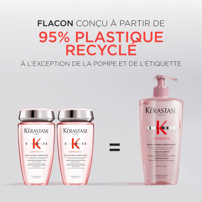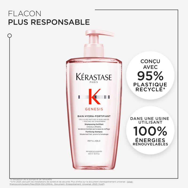 Le flacon de shampooing rechargeable de 500 ml, fabriqué avec 95 % de plastique recyclé***, dans une usine Waterloop**** qui a atteint 100 % d'énergie renouvelable*****, peut être réutilisé avec la recharge de shampooing associée, fabriquée avec -82 % d'emballages en plastique******.