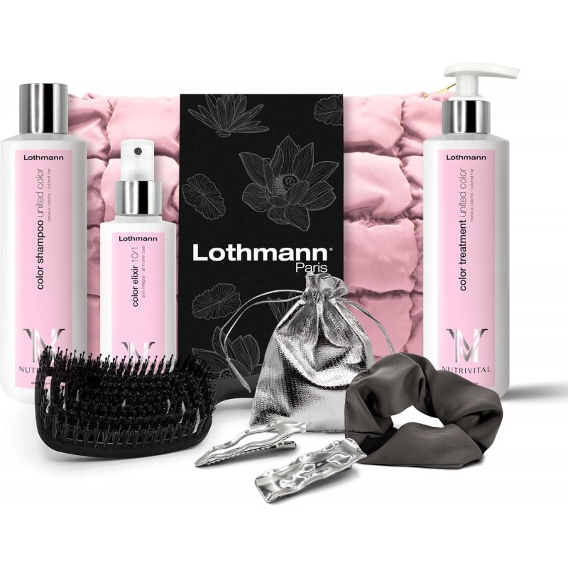 Découvrez le coffret cadeau UNITED COLOR de Lothmann Paris, spécialement conçu pour les cheveux colorés. Ce set complet comprend tout ce dont vous avez besoin pour maintenir l'éclat de votre coloration : un shampooing Color Shampoo nourrissant, un soin Color Treatment revitalisant, et un Color Elixir protecteur. Le coffret inclut également une brosse Curve ergonomique pour un coiffage optimal, ainsi qu'une élégante barrette argentée et un chouchou assorti (modèles variables). L'ensemble est présenté dans une magnifique trousse aux tons roses délicats, ornée du design signature Lothmann Paris avec ses motifs floraux raffinés. Cette routine capillaire professionnelle offre une solution complète pour préserver l'intensité et la beauté de vos cheveux colorés. Un cadeau idéal pour prendre soin de sa chevelure avec des produits de qualité supérieure.